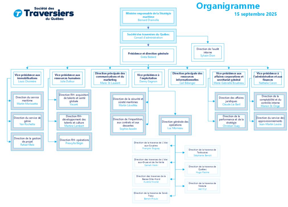 L'organigramme présente la structure administrative de la STQ et le partage des responsabilités de gestion. Cet organigramme regroupe le nom et les titres des membres du personnel de direction ou d'encadrement.